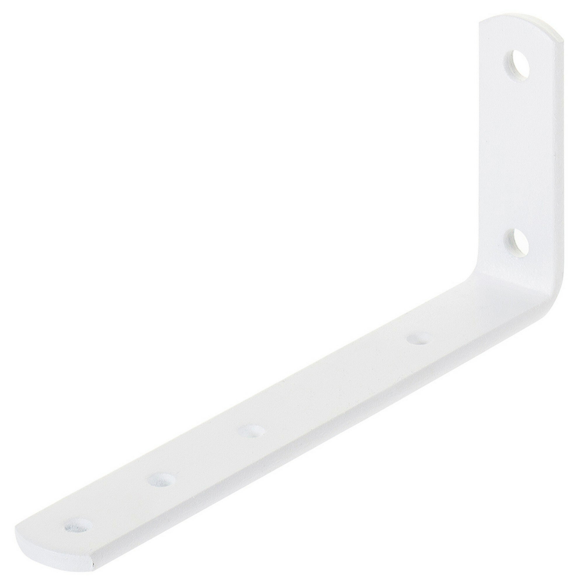 Угловой кронштейн (уголок) применяется как опора/держатель и фиксируется к основанию саморезами, обеспечивая жёсткое соединение под прямым углом. Для данной модели указывают материал — углеродистая сталь, а также то, что изделие выполнено из стали, стойкой к механическим повреждениям и коррозии. Белое матовое покрытие делает крепёж менее заметным на светлых стенах и в большинстве интерьеров.