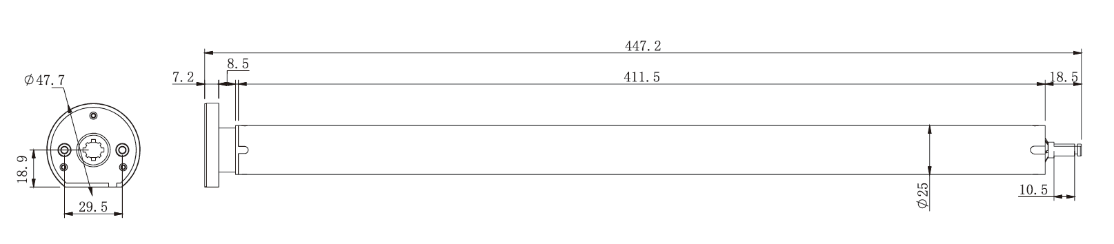AM25-1.2/30-ES-E — аккумуляторный мотор с зарядкой от DC 5V через USB‑C и сигналом низкого заряда, рассчитанный на удобное управление с RF‑пульта. Электронные ограничители на датчиках Холла обеспечивают автоматическую коррекцию смещения конечных положений, а также доступны плавный старт/остановка, точная регулировка положения (пошаговое jog или непрерывное движение) и функция запоминания хода.