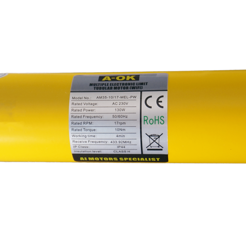 ОПТМОТОР поставляет мотор A-OK AM35-10/17-MEL-PW — это трубчатый DC‑мотор с электронными ограничителями и питанием от сети переменного тока (240V AC), который сочетает радиоуправление (RF) и управление по Wi‑Fi сценарии/приложение/голосовое (RF+WiFi) для систем внутренних солнцезащитных изделий (рулонные, «зебра», «шангри‑ла», венецианские, ZIP).