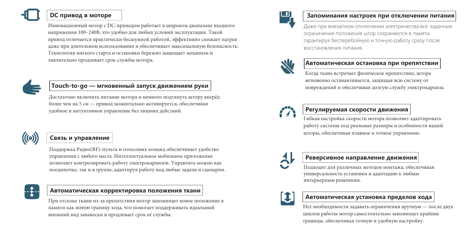 - Touch-to-go: запуск движением — достаточно потянуть штору вперёд более чем на 5 см.